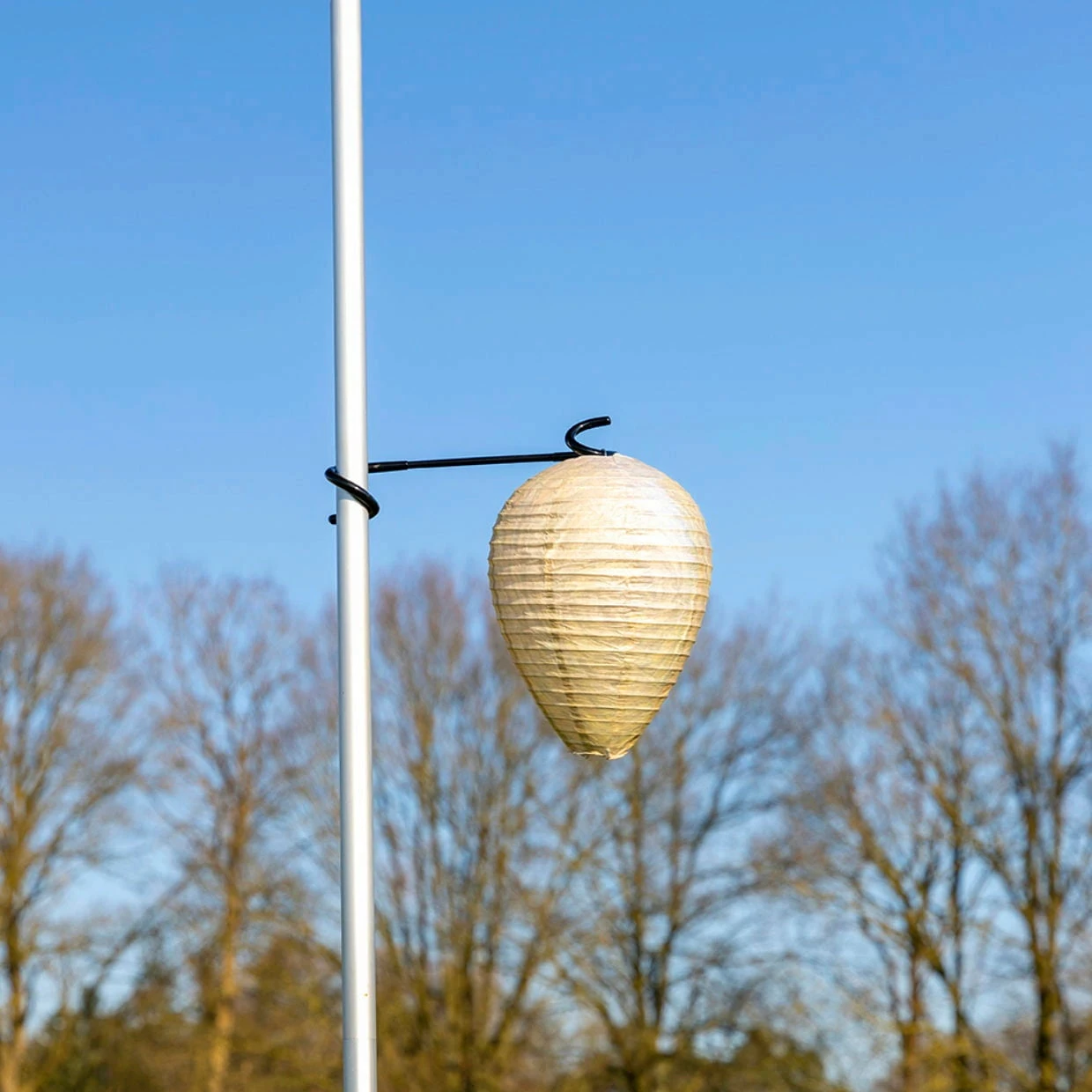 Die Wespennest-Attrappe ist eine umweltschonende und tierfreundliche Möglichkeit, den Bau von Wespennestern zu verhindern. Sie imitiert ein bestehendes Wespennest, sodass Wespen im Umkreis von ca. 60 Metern nicht mit dem Nestbau beginnen und sich einen anderen Platz suchen. Angebracht werden sollte die Attrappe bereits im Frühjahr, an einem geschützten Ort im Freien.