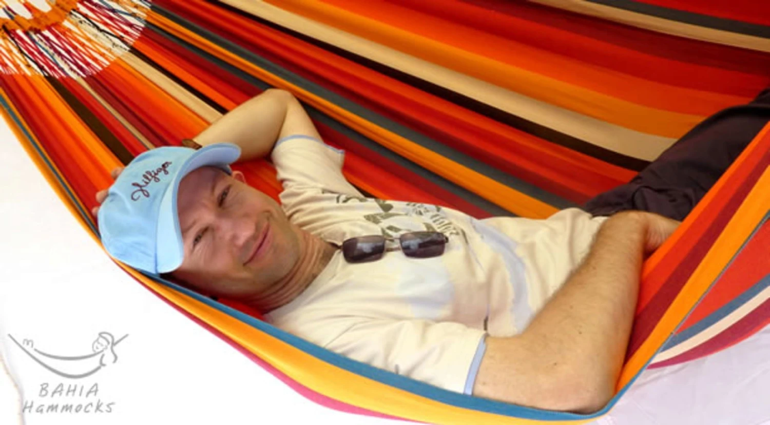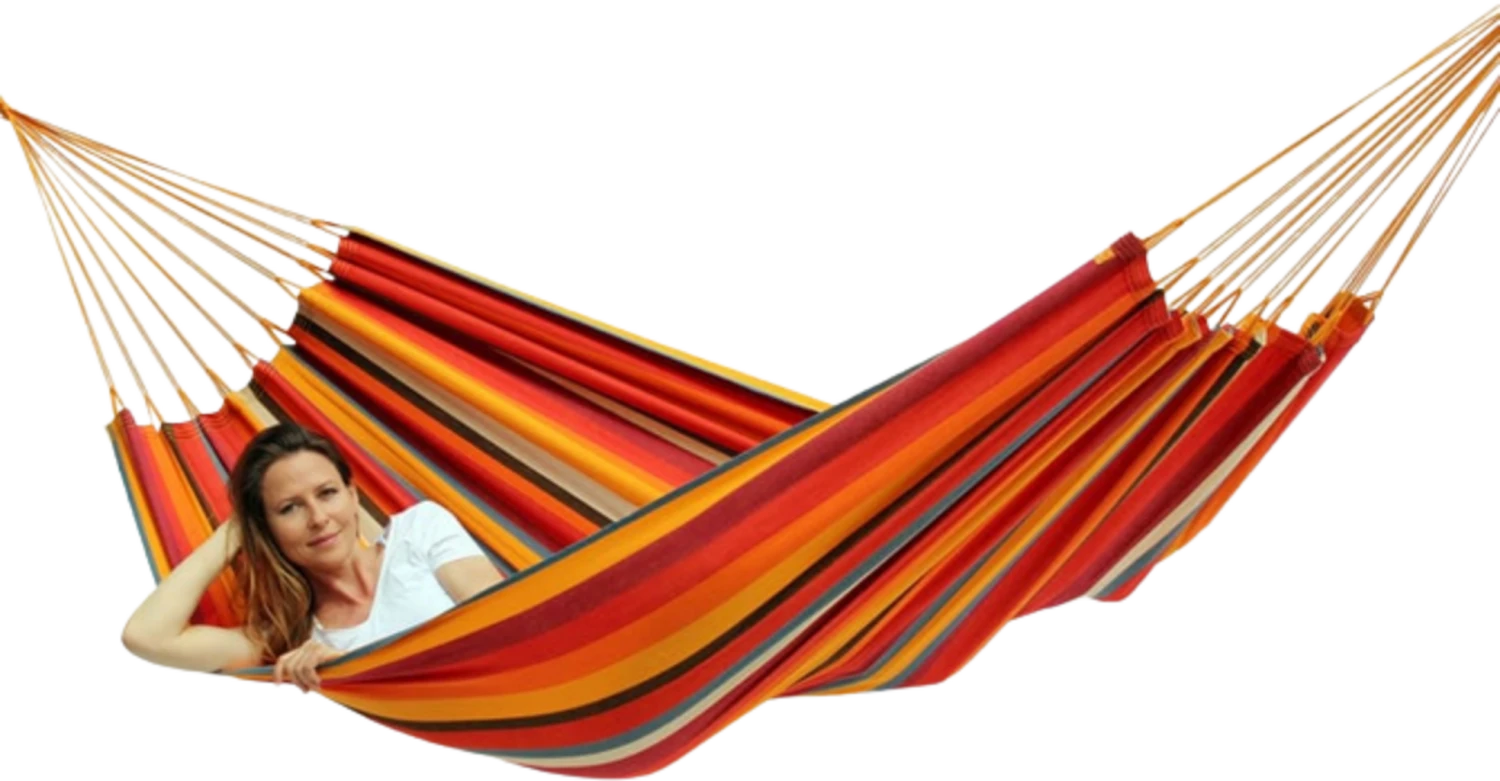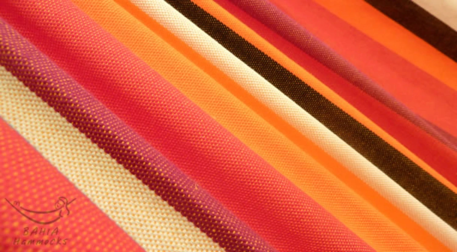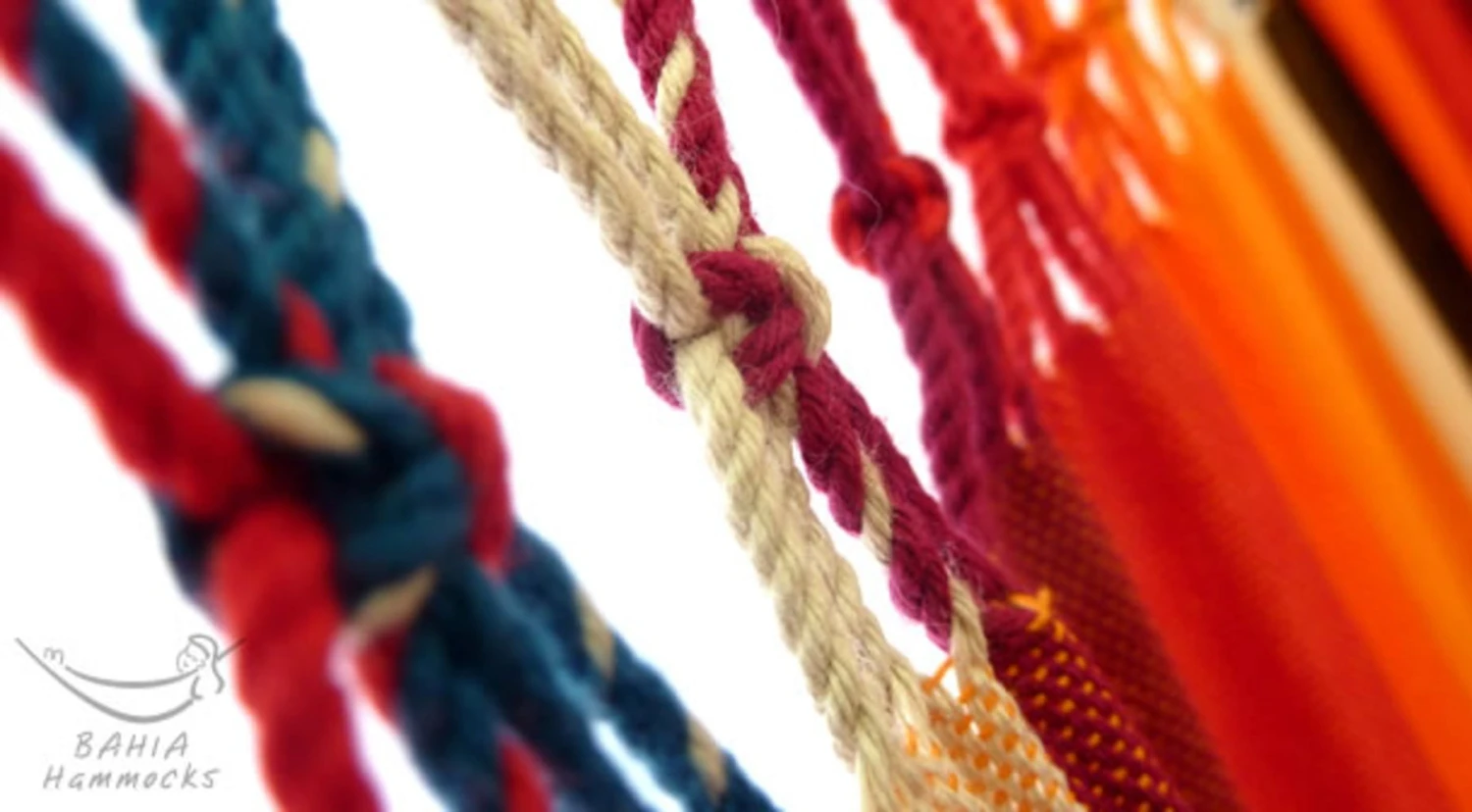 Wunderschöne, fair gehandelte Hängematte in bunten, auffälligen Farben und großzügiger Liegefläche. Die Übergänge sind robust und handgeknüpft. Das Material ist aus 100% echter Baumwolle und die Farben sind AZO-frei.