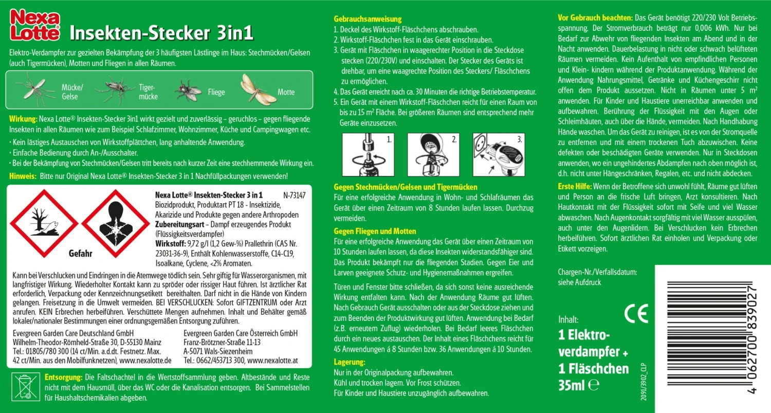Nur bei Bedarf zur Abwehr von fliegenden Insekten am Abend und in der Nacht anwenden. Dauerbelastung in nicht oder schwach belüfteten Räumen vermeiden. Kein Aufenthalt von empfindlichen Personen und Kleinkindern während der Produktanwendung.Nicht in Räumen unter 5 qm anwenden.Für Kinder und Haustiere unerreichbar anwenden und aufbewahren.Berührung der Flüssigkeit mit den Augen oder Schleimhäuten, auch über die Hände, vermeiden. Nach Handhabung Hände waschen.Erste Hilfe: Bei Berührung der Flüssigkeit mit Haut oder Augen sofort gründlich mit Wasser waschen. Bei Verschlucken: Betroffenen ruhig stellen. Arzt konsultieren.Gerät nach jedem Gebrauch ausschalten oder aus der Steckdose ziehen.In unmittelbarer Nähe der benutzten Steckdose dürfen keine wärmeempfindlichen Geräte Thermostate, Schalter und so weiter) oder Abdeckungen angebracht sein.Nur in Steckdosen anwenden, wo ein ungehindertes Abdampfen nach oben möglich ist, das heißt nicht unter Hängeschränken, Regalen und so weiter.Mittel ist schädlich für Wasserorganismen, kann in Gewässern längerfristig schädliche Wirkungen haben. Daher von Gewässern fernhalten. Terrarien, Aquarien oder Tierkäfige vor der Anwendung entfernen.Nur Original Nexa Lotte Nachfüllpackungen verwenden.