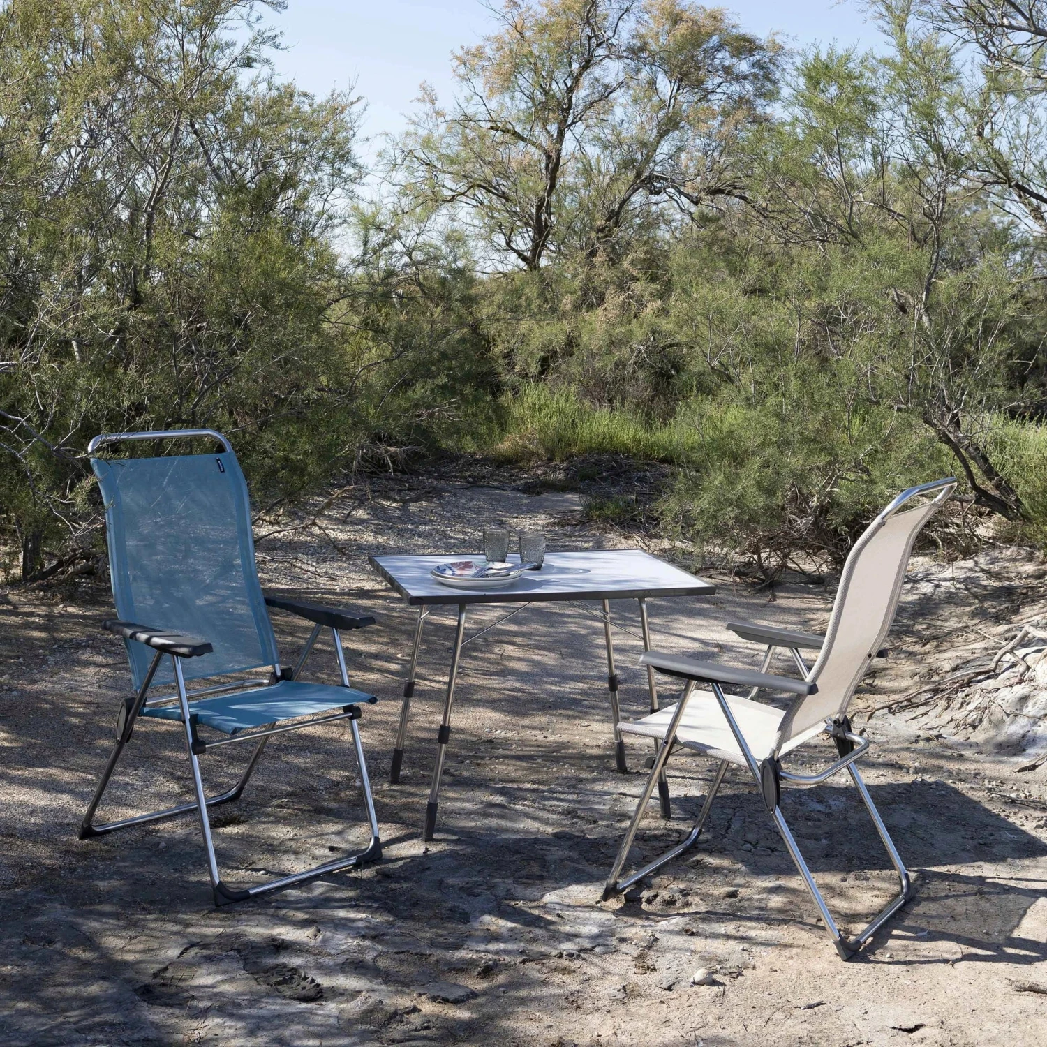 Zwei bis vier Personen können es sich an diesem Tisch auf jeden Fall gemütlich machen. Er ist höhenverstellbar und platzsparend zusammenzuklappen, genau was beim Camping gefragt ist. Das dicke Rohrgestell ist stabil und fest, ebenso die Tischplatte, welche bis zu 140° C hitzebeständig ist.