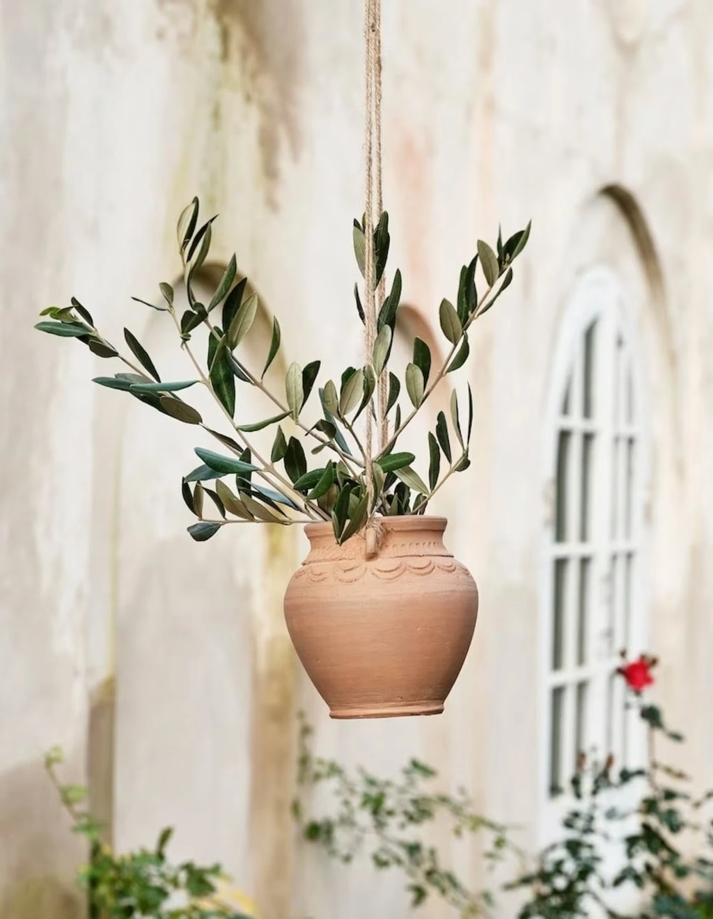 Handgefertigtes Pflanzengefäß aus Ton mit Jutekordel zum Hängen. Durch die dekorative Schnitzerei wird das Gefäß zum besonderen Hingucker im Außenbereich.