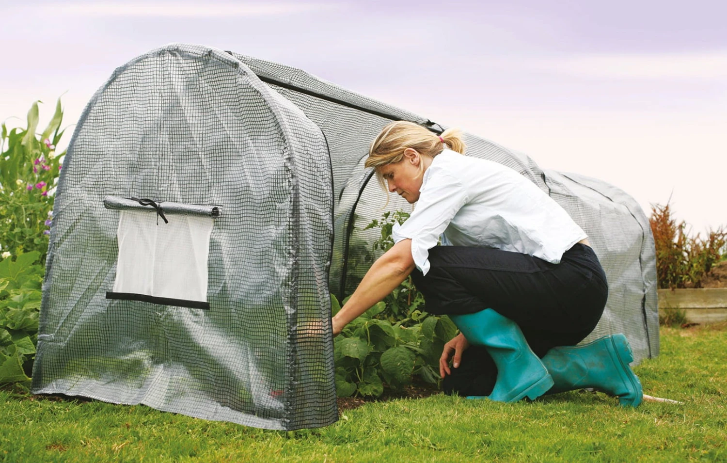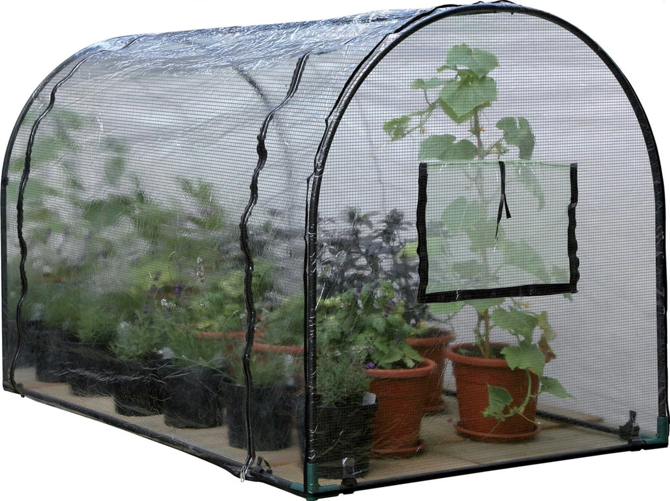 Vier große Reißverschlüsse schaffen den idealen Zugang zu den Pflanzen. Die Polyethylen Hülle passt perfekt übe den Rahmen. An beiden Enden befinden sich Insektendichte Lüftungsklappen.