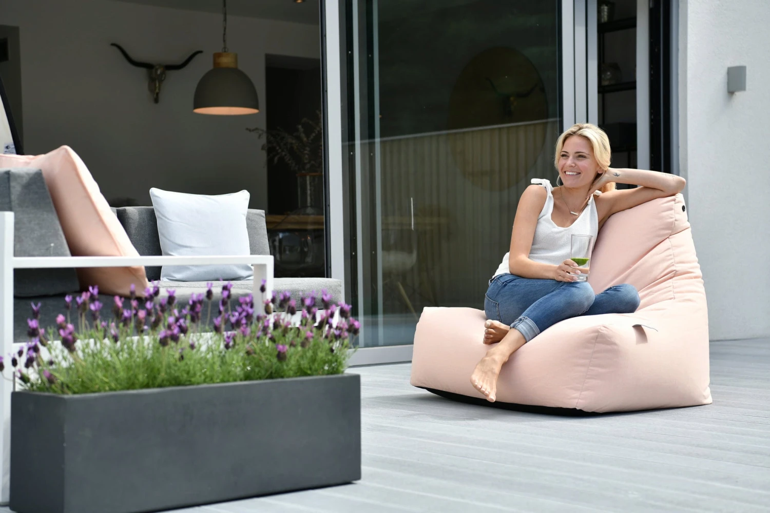 Der Sitzsack besteht aus einem Outdoor-Stoff mit einem UV-Filter, welcher die Farbe schön hält und nicht ausbleichen lässt.