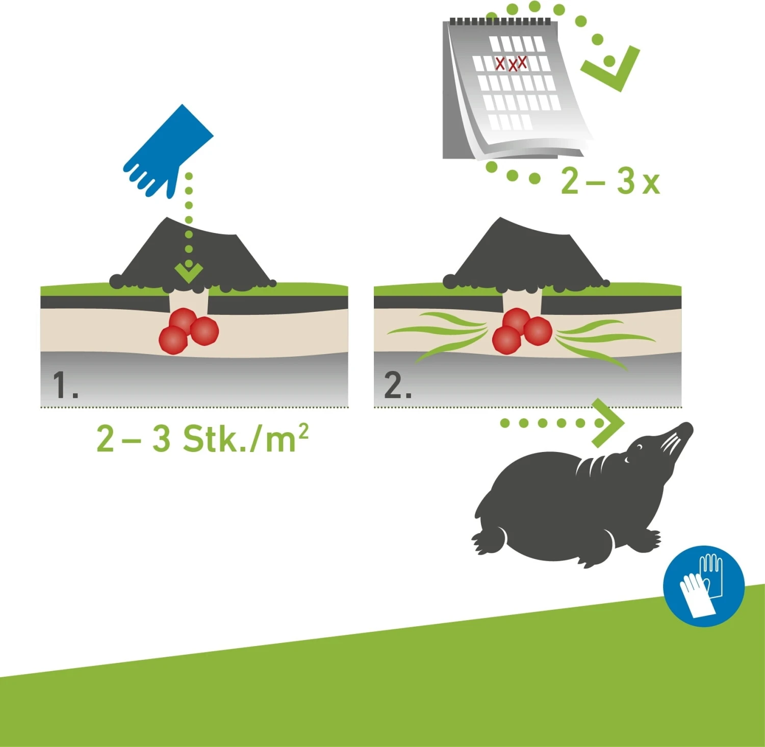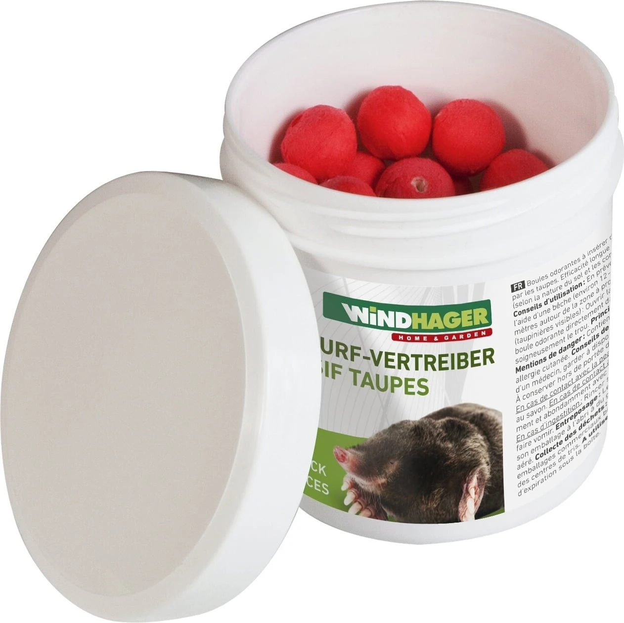 Der Maulwurf steht unter Naturschutz, aber was kann man dennoch tun, wenn der schöne Garten durch Maulwurfshügel verunstaltet wird? Die Maulwurf-Abwehr-Kugeln schaffen hier Abhilfe. Denn der Maulwurf ist als sehr geruchsempfindlich bekannt und die Pellets haben einen für ihn sehr abstoßenden Duft. Machen Sie einfach den Maulwurfhügel frei und legen Sie eine Kugel in den Gang. Dadurch werden sie langfristig vertrieben.
