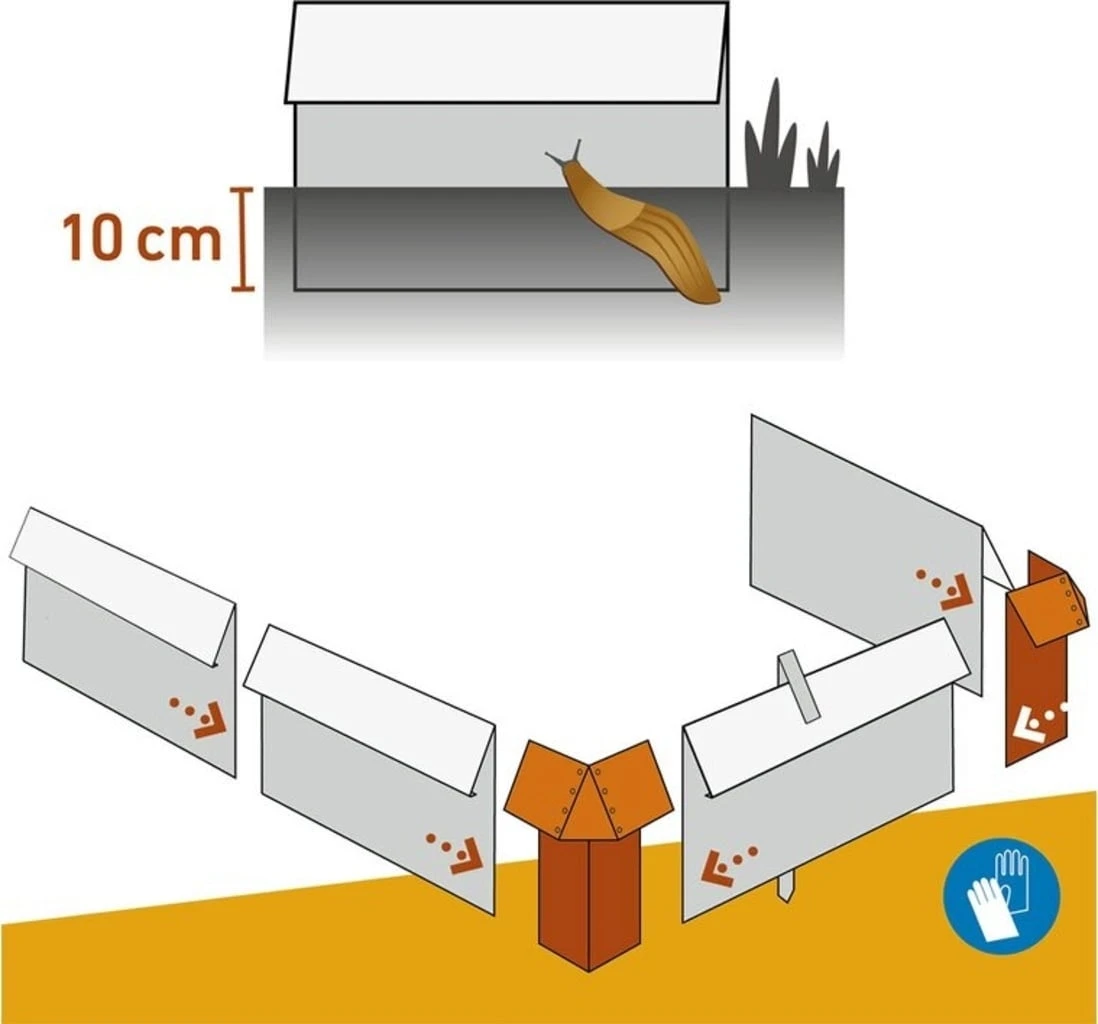Für den Aufbau eines anwendungsfertigen Schneckenzauns werden 4 Wände, 4 Außenecken sowie Klammern benötigt. Die einzelnen Elemente des Schneckenzauns sind mit wenigen Handgriffen miteinander verbunden.